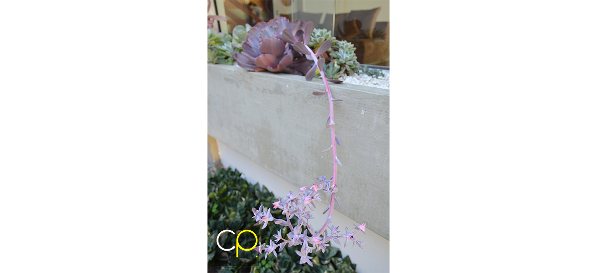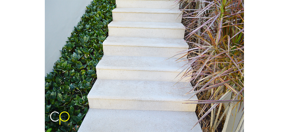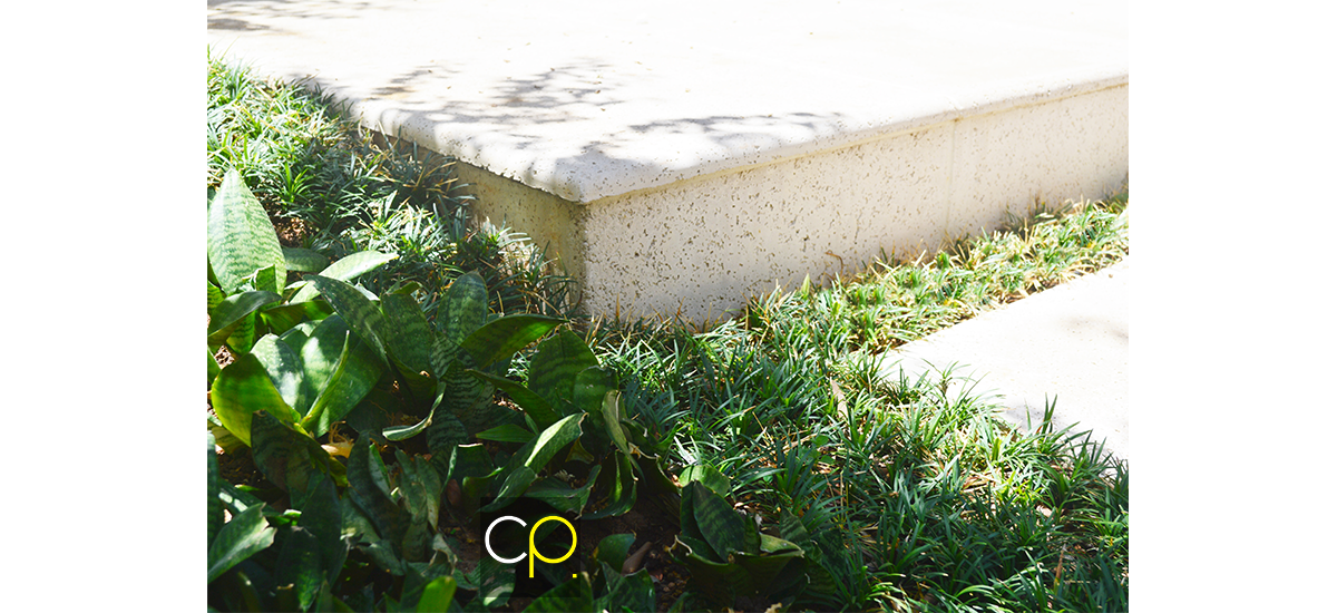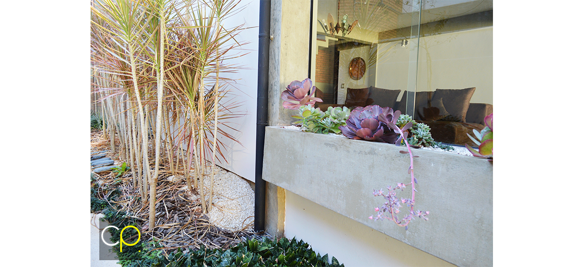 Como patamares incorporados a topografia do terreno, os grandes degraus da circulação proporcionam um caminhar pausado, possibilitando a observação dos detalhes do Projeto de Paisagismo. A geometria da forração de Grama preta e Mini Espada de São Jorge harmonizam com as floreiras cobertas de suculentas das espécies de Orelha de Elefante e Rosa de Pedra.