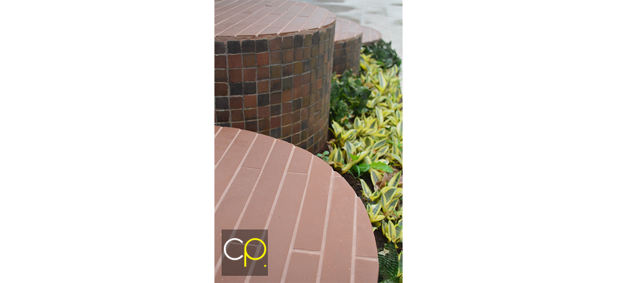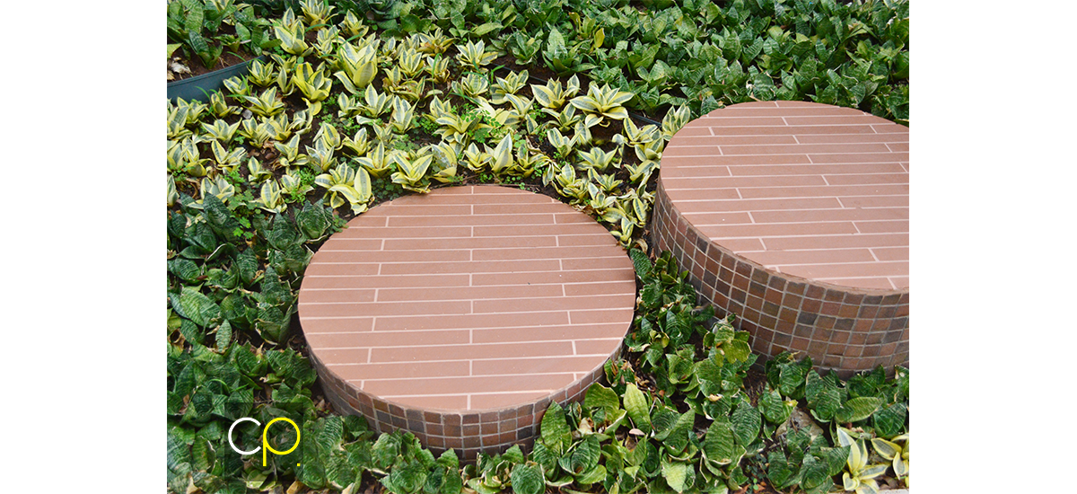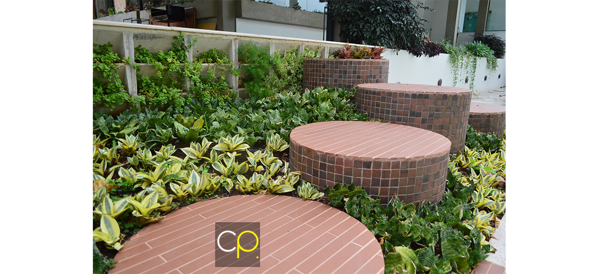 Servindo como arrimo, ergueu-se um muro verde com blocos de concreto aparente compondo-se das espécies de Rosinha de Sol, Bromélia Fireball, Peperomia pendente e Aspargo que se adequam muito bem a esta proposta.