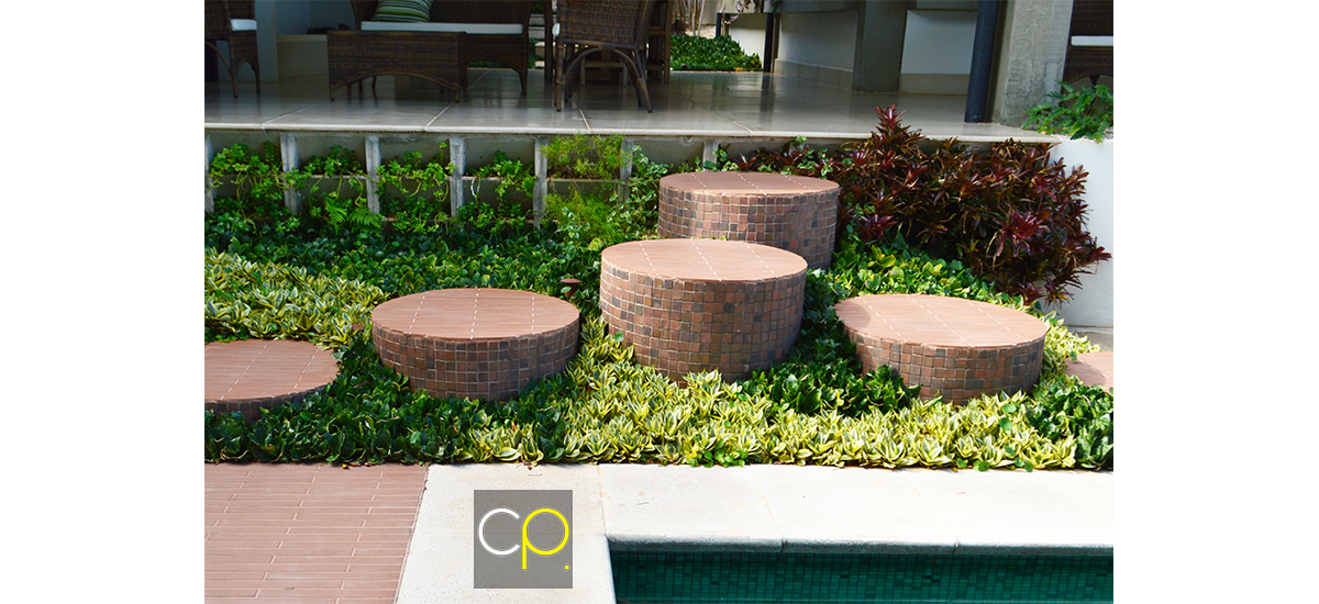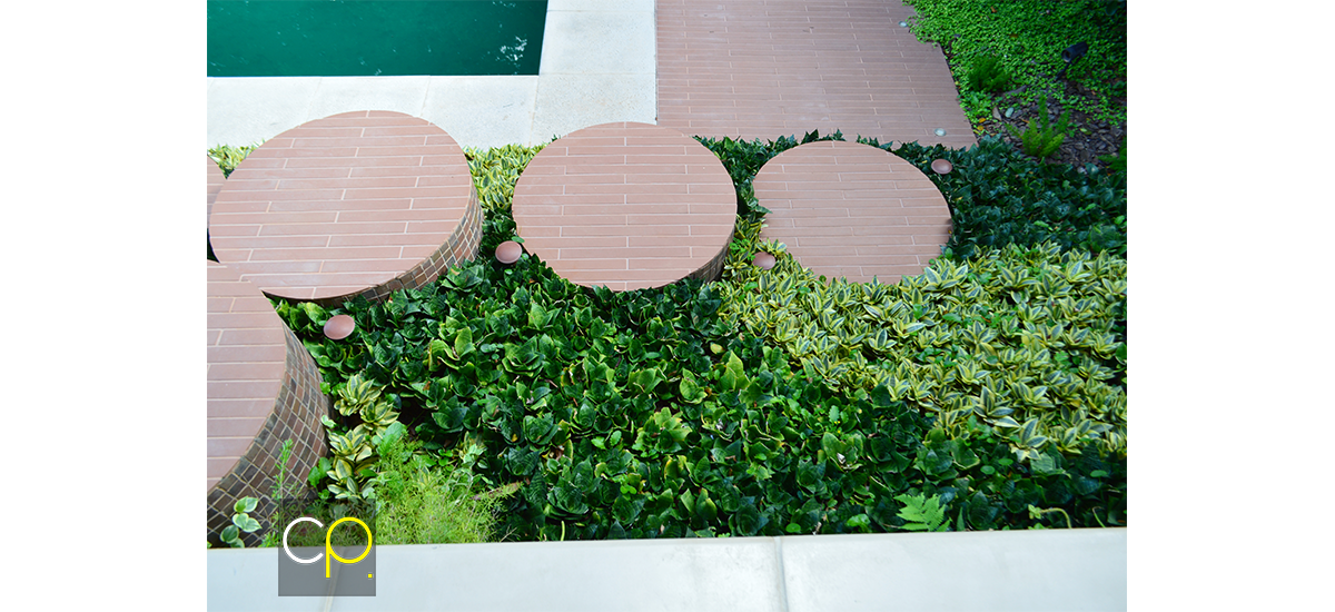 Para o acesso à piscina da residência foram elaborados degraus soltos sobre o jardim, criando, através de níveis e de diferentes tonalidades de espécies de Mini Espada de São Jorge, a sensação de movimento.