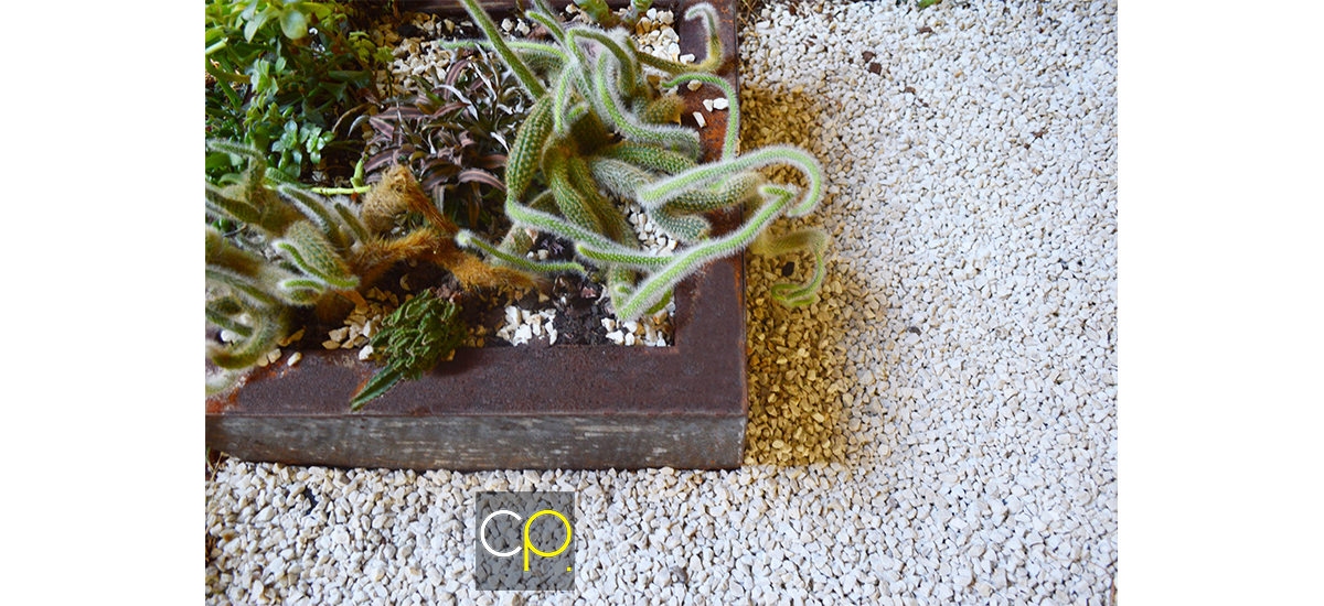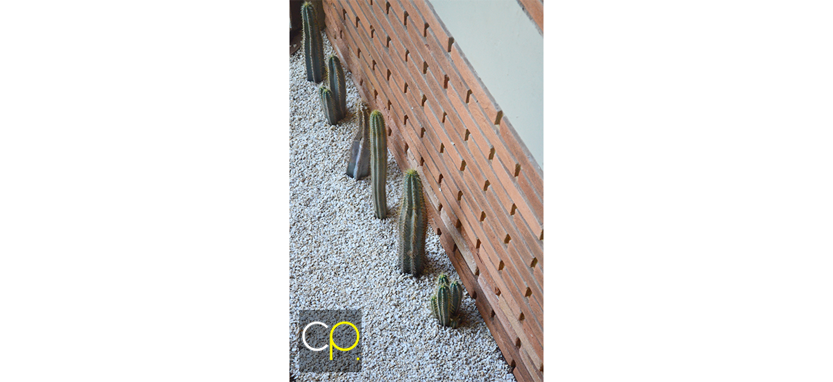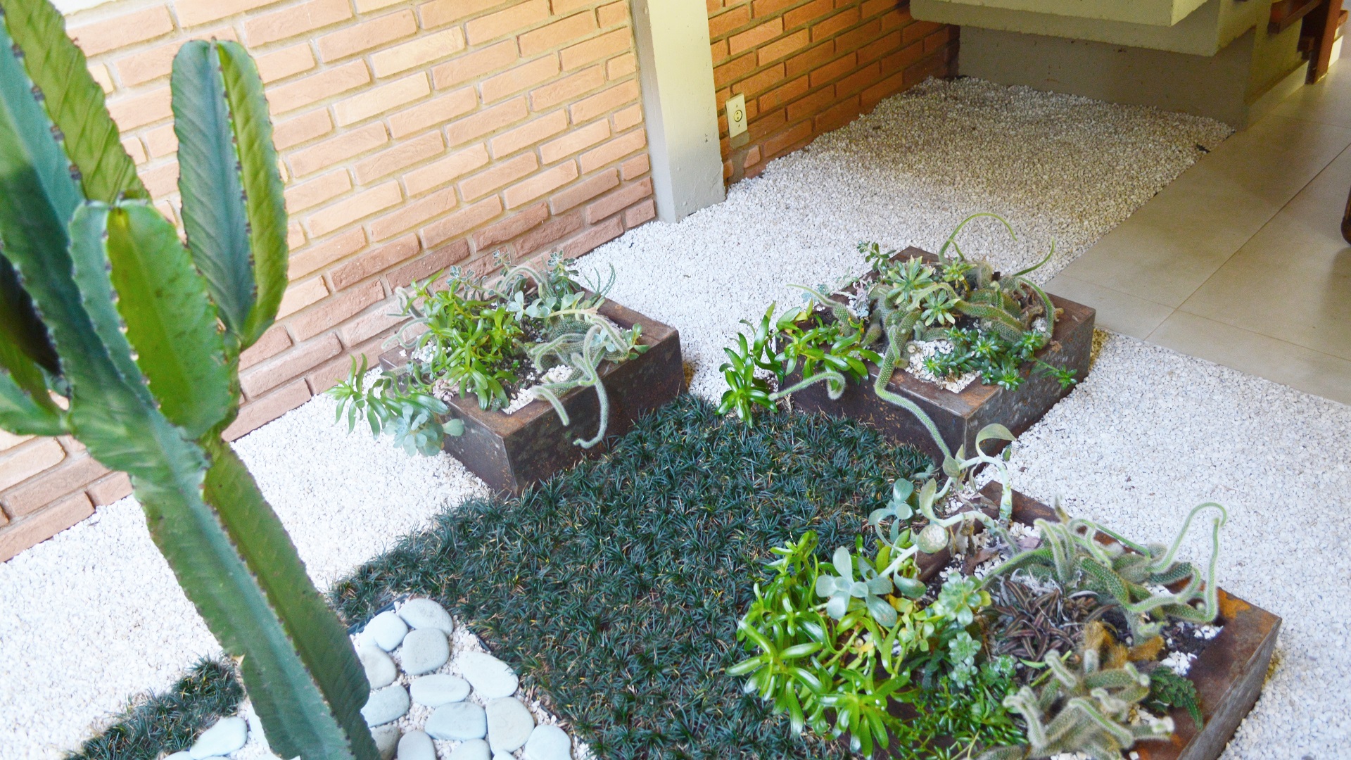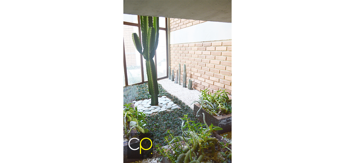 O cacto foi posicionado como espécie evidência, recebendo destaque pelas pedras vulcânicas contrastando com seu colorido natural. Foram utilizadas outras diferentes texturas, em forração natural, como a Grama Preta e a Grama Azul que se harmonizaram com as espécies de suculentas suspensas nas caixas metálicas oxidadas.