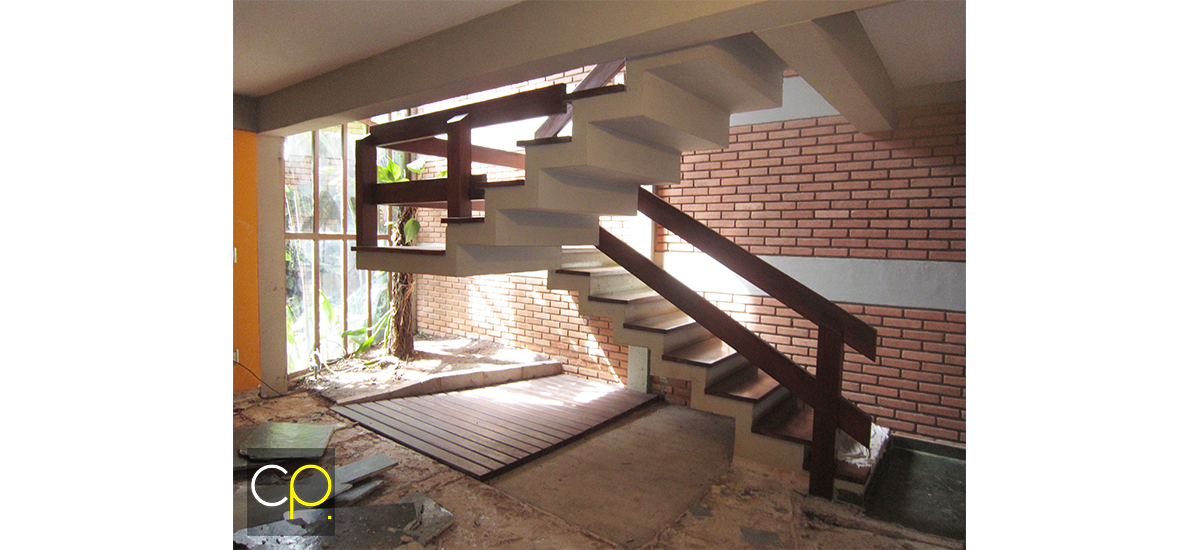 Na reforma para trocar o antigo piso interno da residência ampliou-se a área de Jardim de Inverno já existente sob a escada.